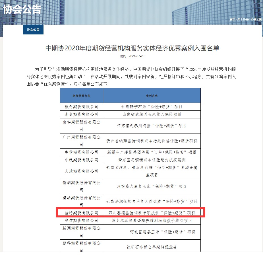2021年7月29日,中國期貨業(yè)協(xié)會(huì )公布了“2020年度期貨經(jīng)營(yíng)機構服務(wù)實(shí)體經(jīng)濟優(yōu)秀案例入圍名單”,協(xié)會(huì )經(jīng)過(guò)嚴格評審,在征集的98篇案例中給予了21篇案例入圍協(xié)會(huì )“優(yōu)秀案例庫”,倍特期貨榮譽(yù)登榜!瀏覽 : 8996分享