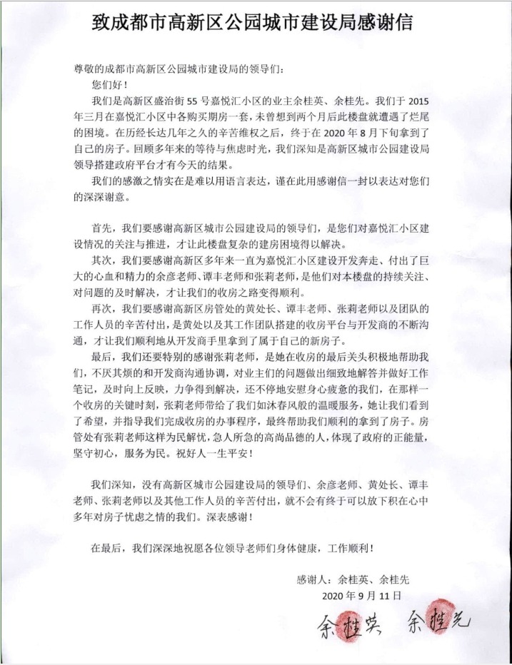 近日,由成都倍特建筑安裝工程有限公司承建的嘉悅匯A標段,歷經(jīng)多方努力,已基本完成了小業(yè)主的交付工作。2020年9月11日,高新發(fā)展法務(wù)部借調到公園局的張莉同志收到來(lái)自嘉悅匯小業(yè)主余桂先、余桂英兩位女士贈送的繡有“為民解憂(yōu)、盡職盡責”、“思民生、解民難、做實(shí)事、暖民心”的錦旗及表?yè)P信。兩位業(yè)主對張莉同志所提供的服務(wù)給與了高度的贊揚和誠摯的感謝。瀏覽 : 12664分享